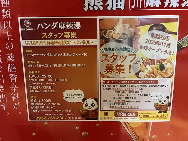 越谷サンシティに熊猫麻辣湯(パンダマーラータン)が11月11日に新規オープンしました。